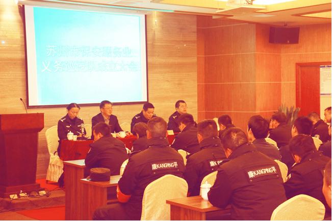 2015年12月3日,蘇州市保安服務(wù)業(yè)義務(wù)巡邏隊(duì)成立大會(huì)在江蘇康平保安服務(wù)有限公司召開。會(huì)議由蘇州市公安局治安支隊(duì)監(jiān)管大隊(duì)教導(dǎo)員陸萍主持,蘇州市公安局治安支隊(duì)副支隊(duì)長(zhǎng)郭偉平、蘇州市公安局治安支隊(duì)監(jiān)管大隊(duì)大隊(duì)長(zhǎng)朱永忠及蘇州市保安服務(wù)行業(yè)協(xié)會(huì)會(huì)長(zhǎng)畢坤明出席了會(huì)議。蘇州市公安局各分局治安大隊(duì)領(lǐng)導(dǎo)及蘇州市五家保安服務(wù)有限公司巡邏員代表50余人參加了會(huì)議。