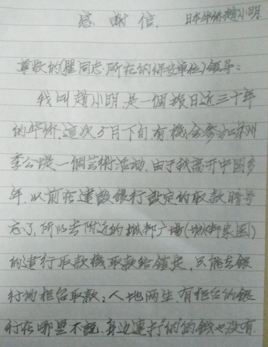5月下旬,隊(duì)員翟紅衛(wèi)在上班執(zhí)勤期間遇到一位老人求助,老人是位多年的旅日華僑,初到蘇州人生地不熟,急需去銀行取款但又不知道詳細(xì)位置且沒(méi)有攜帶現(xiàn)金。在了解了基本情況之后,隊(duì)員翟紅衛(wèi)當(dāng)即為老人查找了附近的銀行地址并代付了車(chē)費(fèi)。